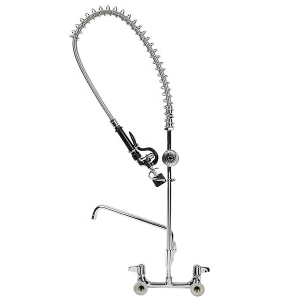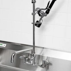 T&S Brass And Bronze Works Equip By T&S 5PR-8W12-C Wall Mounted 35 11/16″ High Pre-Rinse Faucet With 8″ Adjustable Centers, 1.2 GPM Spray Valve, 44″ Hose, 12″ Add-On Faucet, And 6″ Wall Bracket