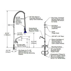 T&S Brass And Bronze Works T&S B-0113-A08-B08C EasyInstall Deck Mounted 46 1/4″ High Pre-Rinse Faucet With Flex Inlets, Ergonomic Low Flow Spray Valve, 44″ Hose, 8″ Add-On Faucet, And 6″ Wall Bracket